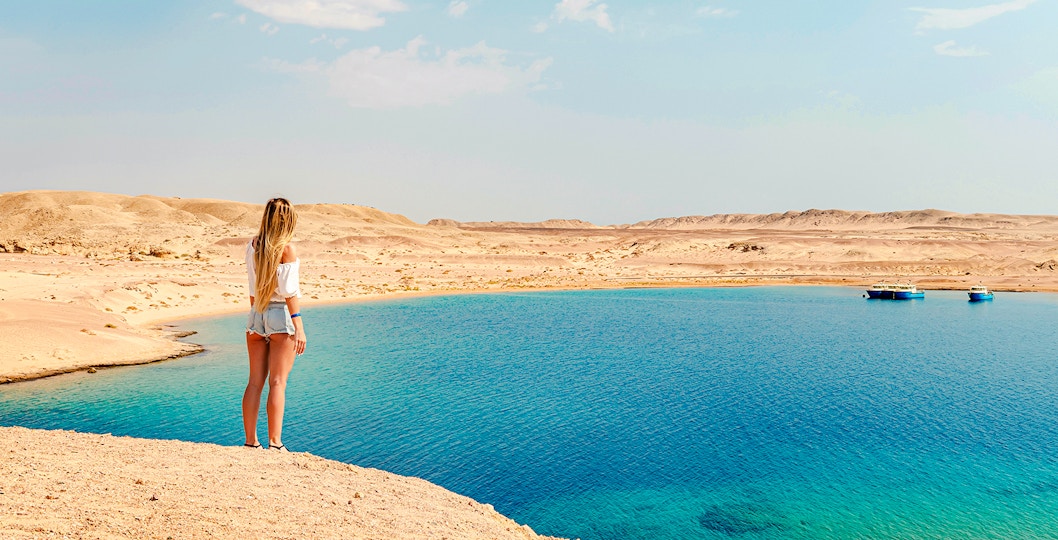 Magic Lake is a stunning saltwater lagoon in Ras Mohamed National Park, Sinai Peninsula, Egypt. Just a short drive from Sharm El-Sheikh, its shimmering blue and green waters contrast beautifully with the surrounding desert sands and cliffs, making it a must-see on any Ras Mohamed day trip.